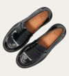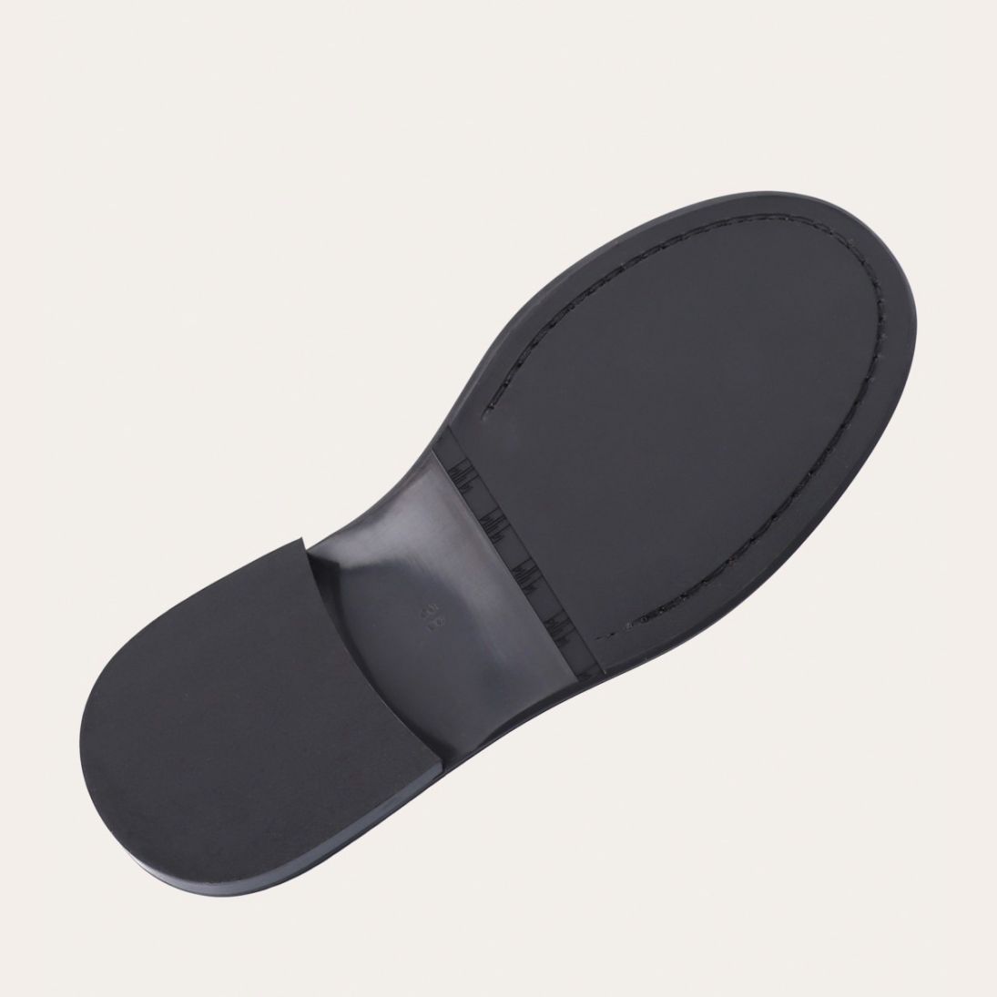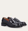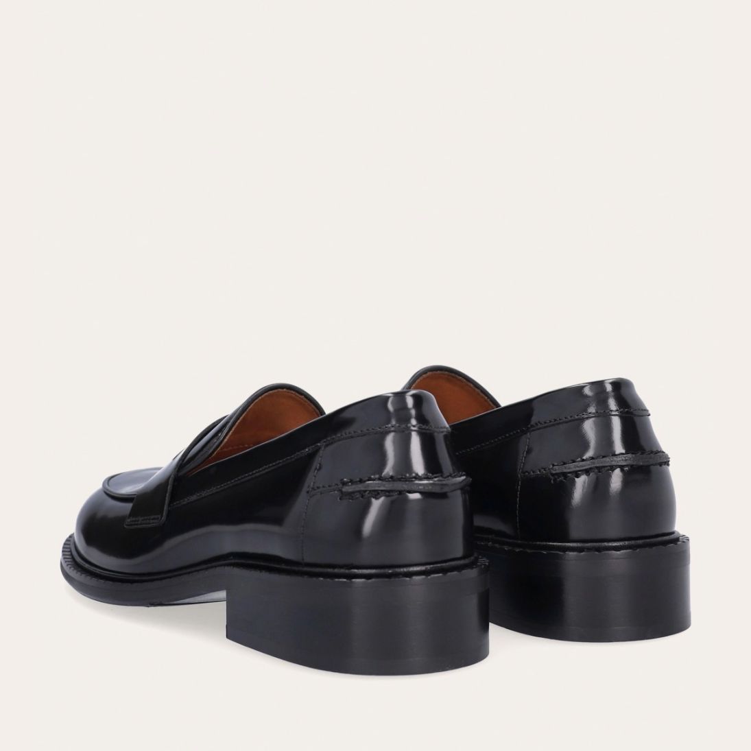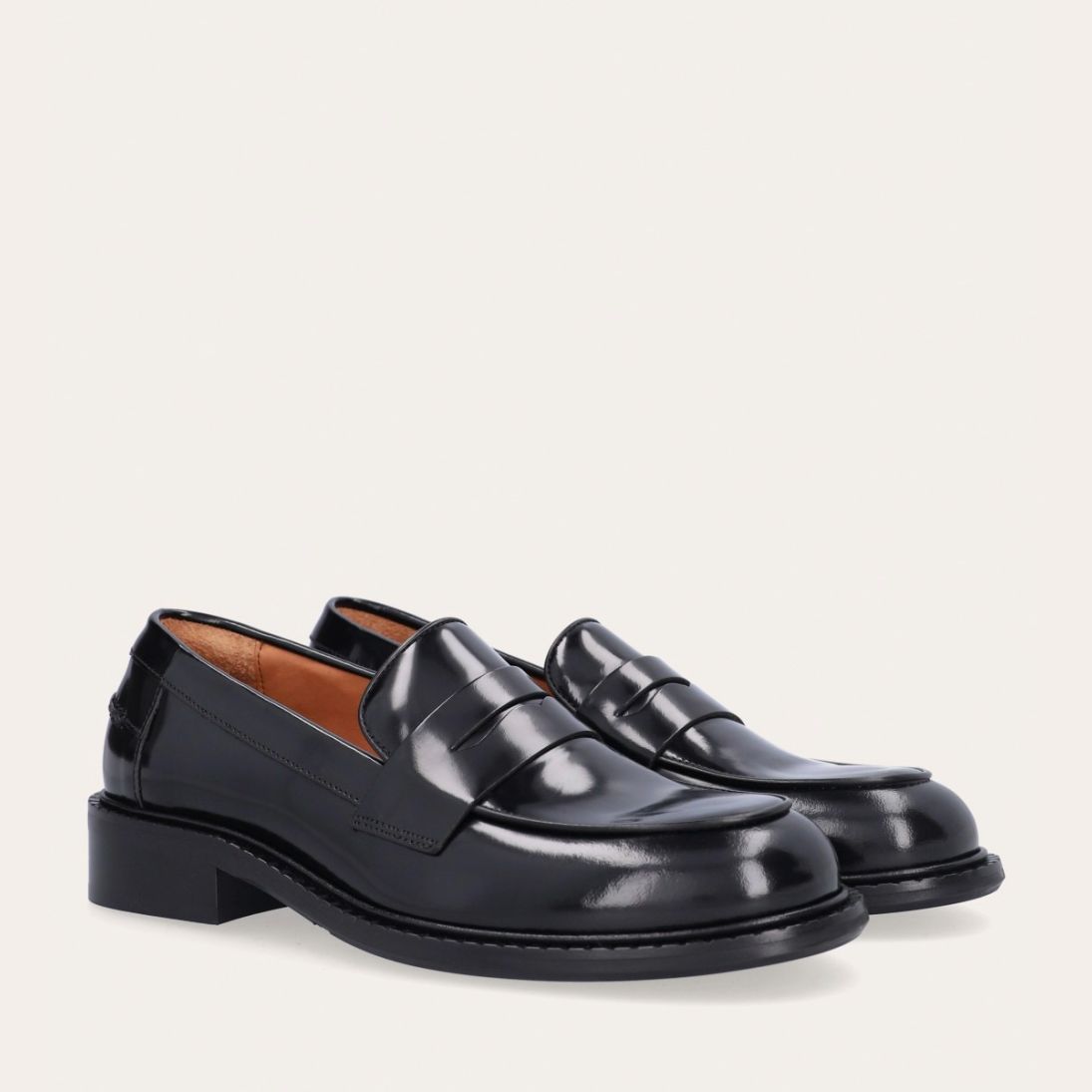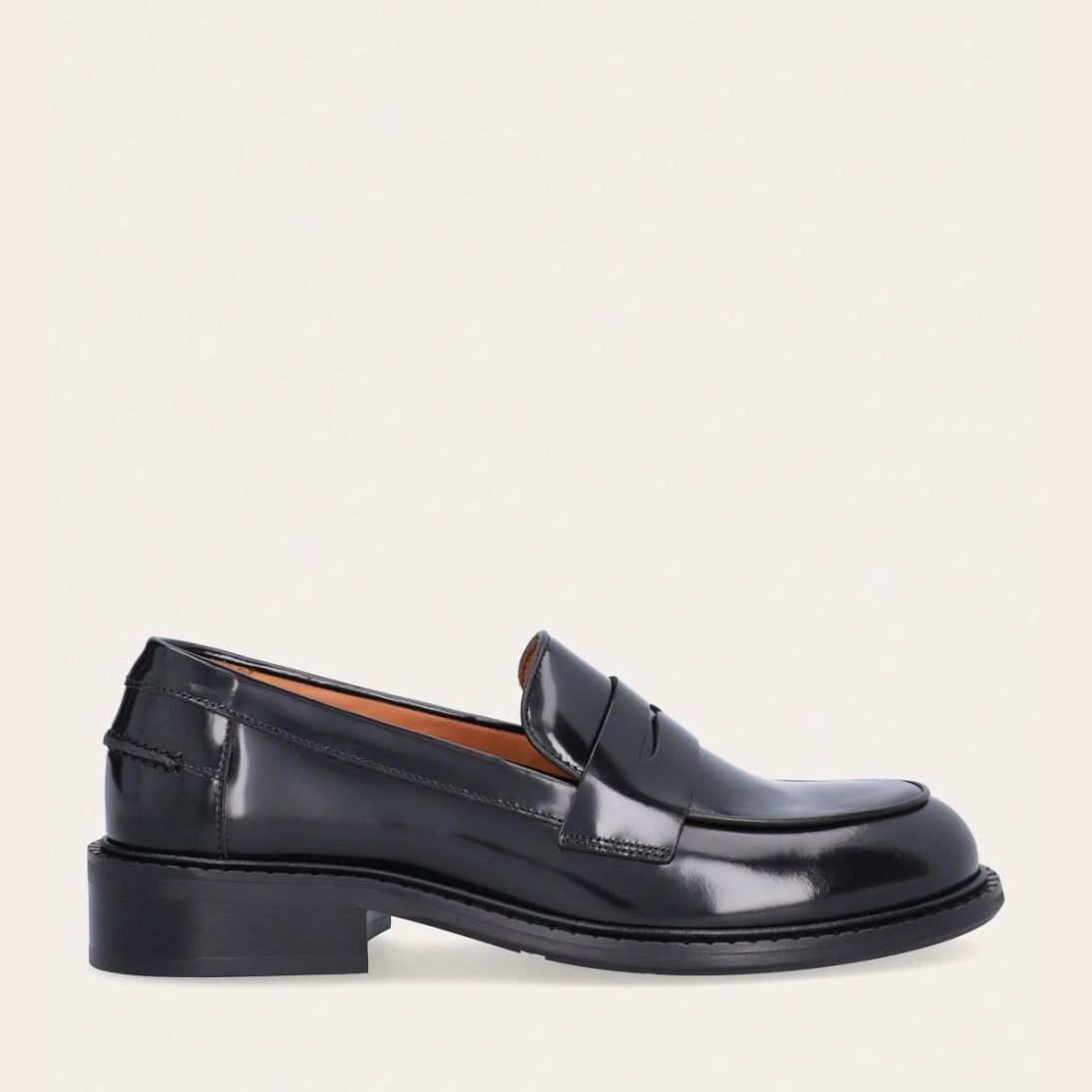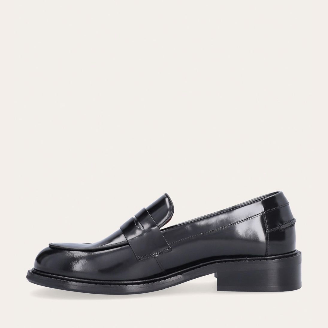 Håndlavet loafer udført i sort polido skind med en rund tå. Loaferen har et dekorativt cut-out henover fronten samt piping foran og bagpå for ekstra dekoration.