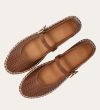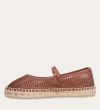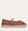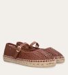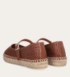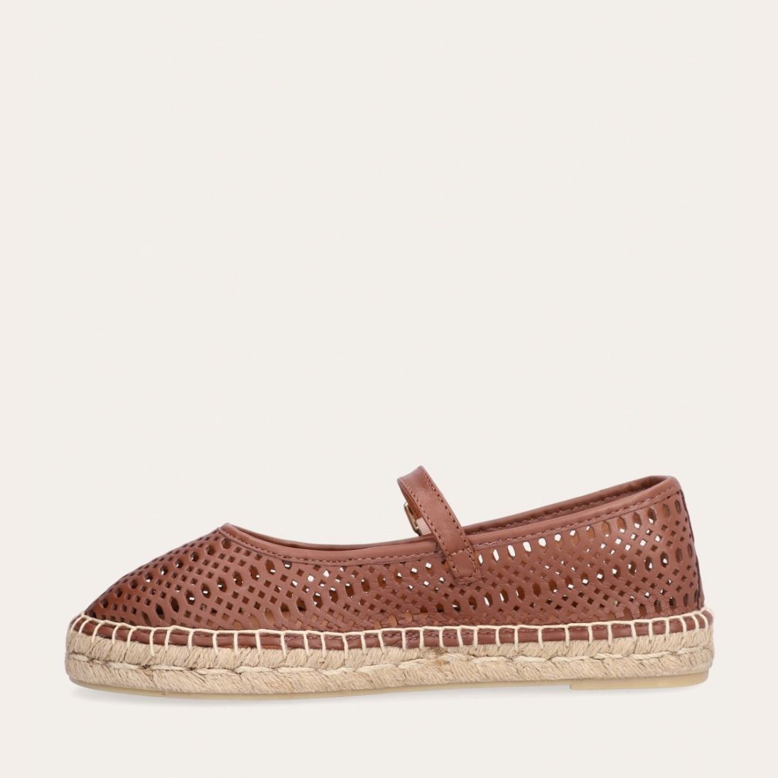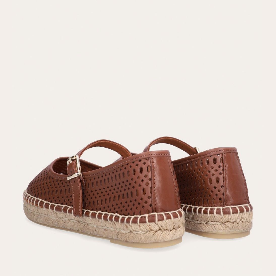 Håndlavet espadrille sko, udført i brunt glat skind med en rund tå. Espadrillen har et attraktivt hulmønster i skindet og en dekorativ strop henover foden med et guld spænde. Sålen er lavet af flettet jute med synlige stikninger, hvilket forstærker det klassiske espadrille-design.