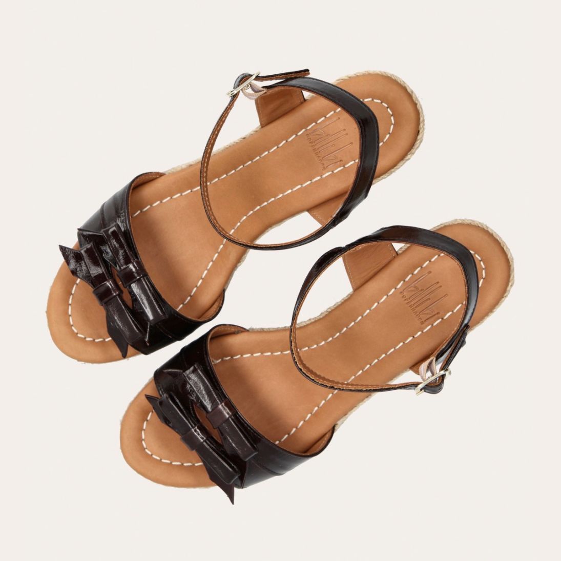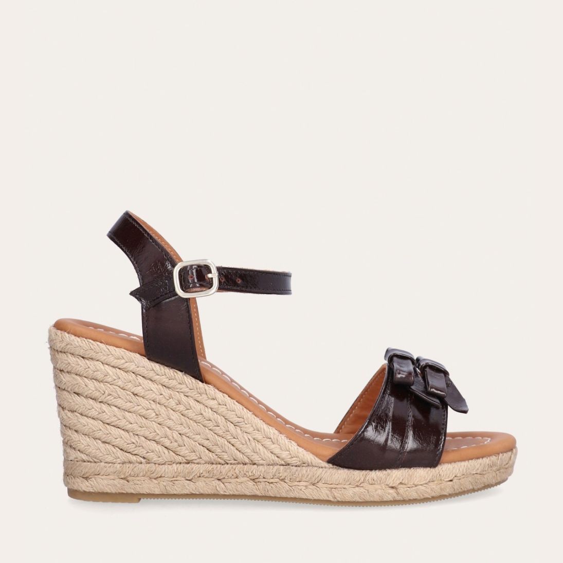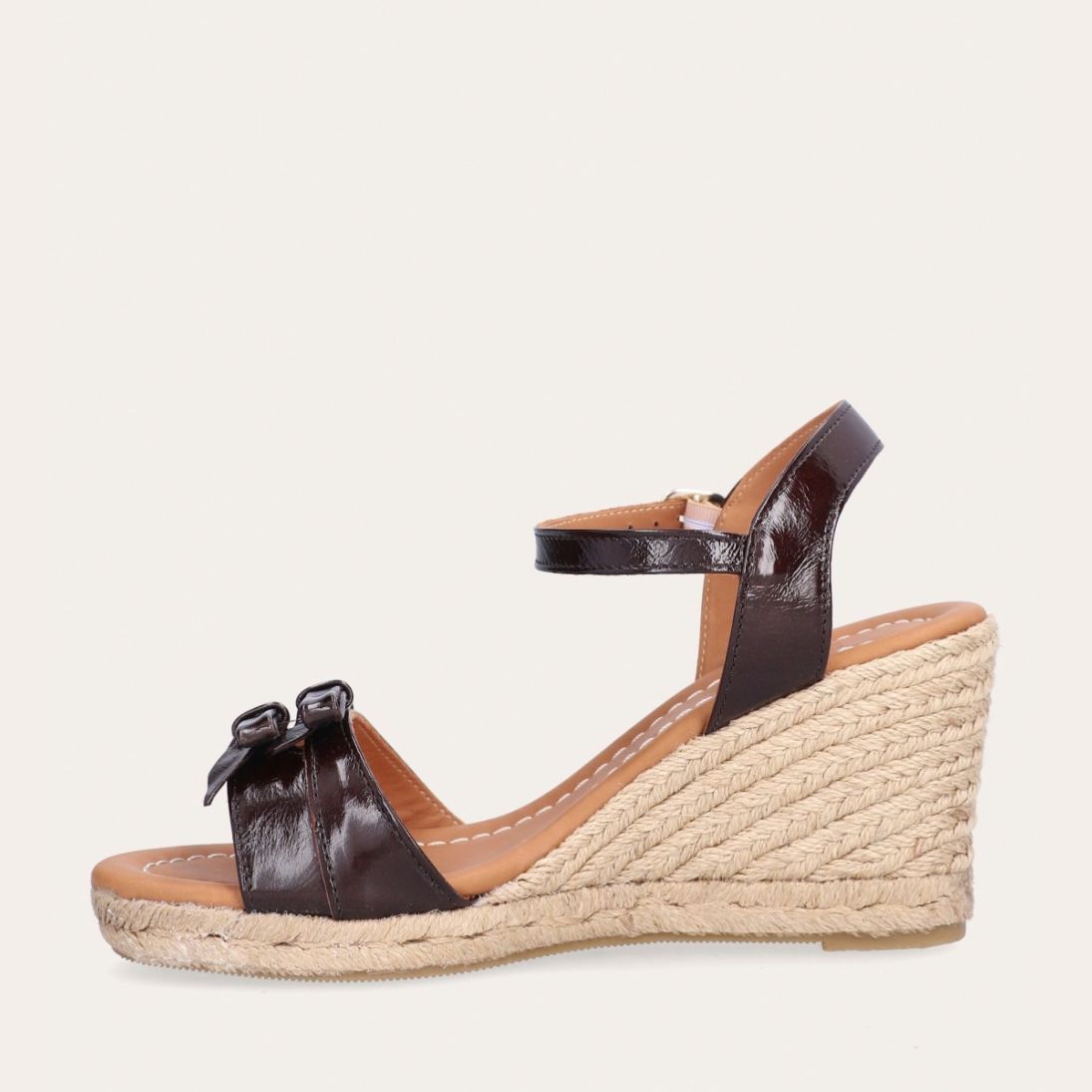 Håndlavet kilesandal udført i mørkebrunt lakeret skind med rund tå og høj hæl. Sandalen er designet med to små sløjfer foran, samt en rem om anklen som lukkes med et sølv spænde.