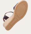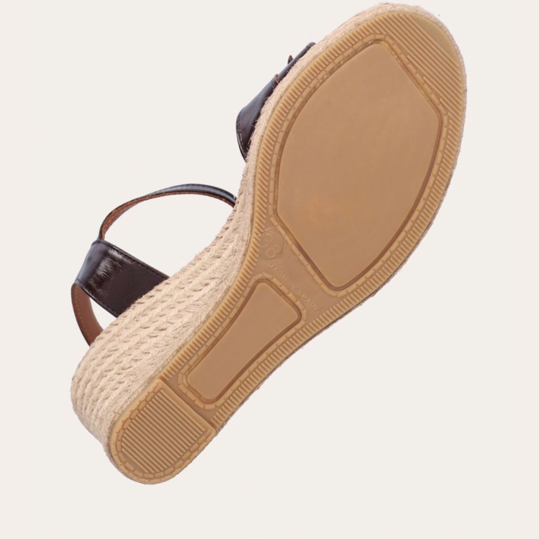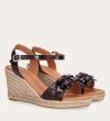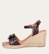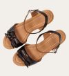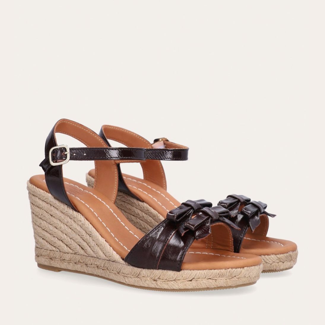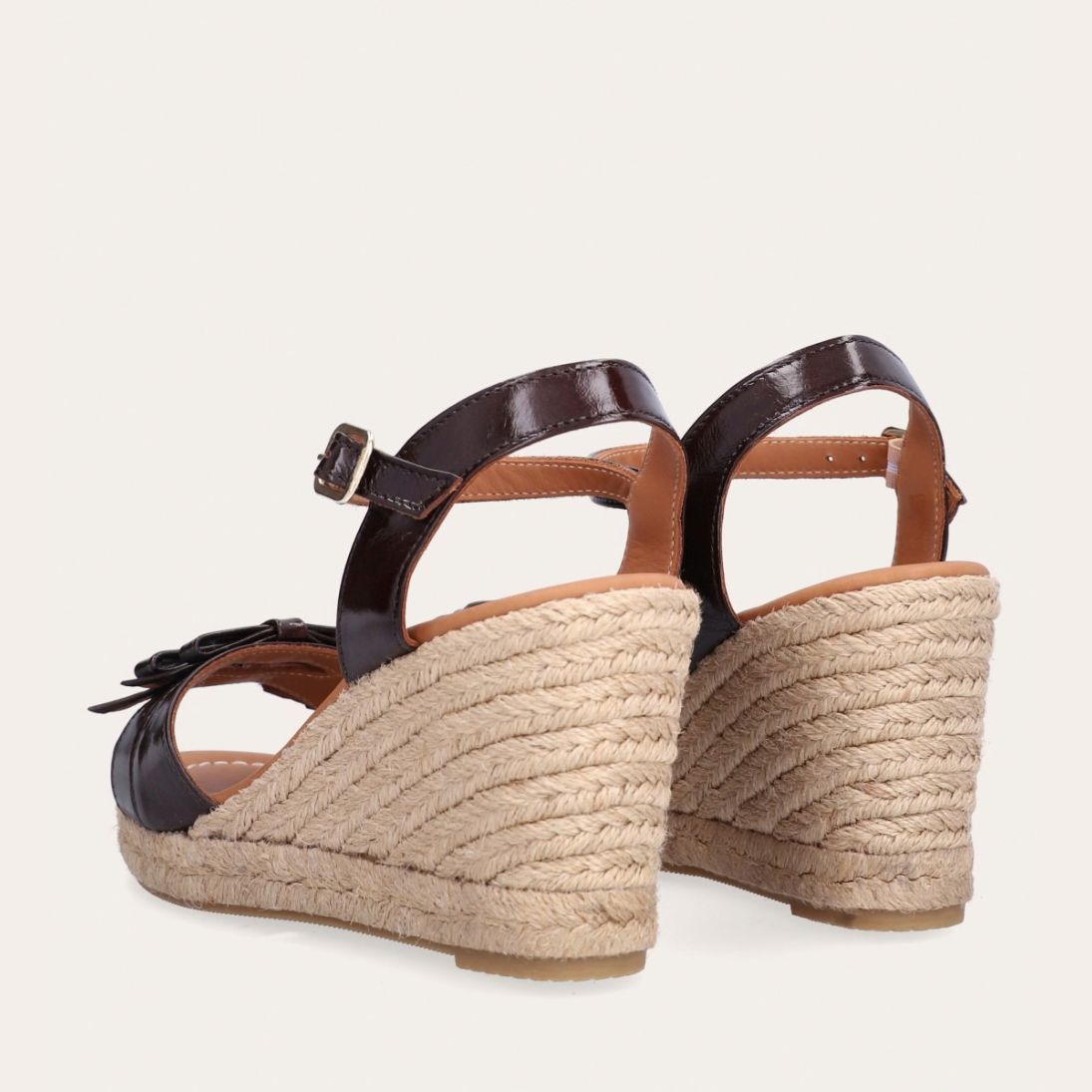 Håndlavet kilesandal udført i mørkebrunt lakeret skind med rund tå og høj hæl. Sandalen er designet med to små sløjfer foran, samt en rem om anklen som lukkes med et sølv spænde.