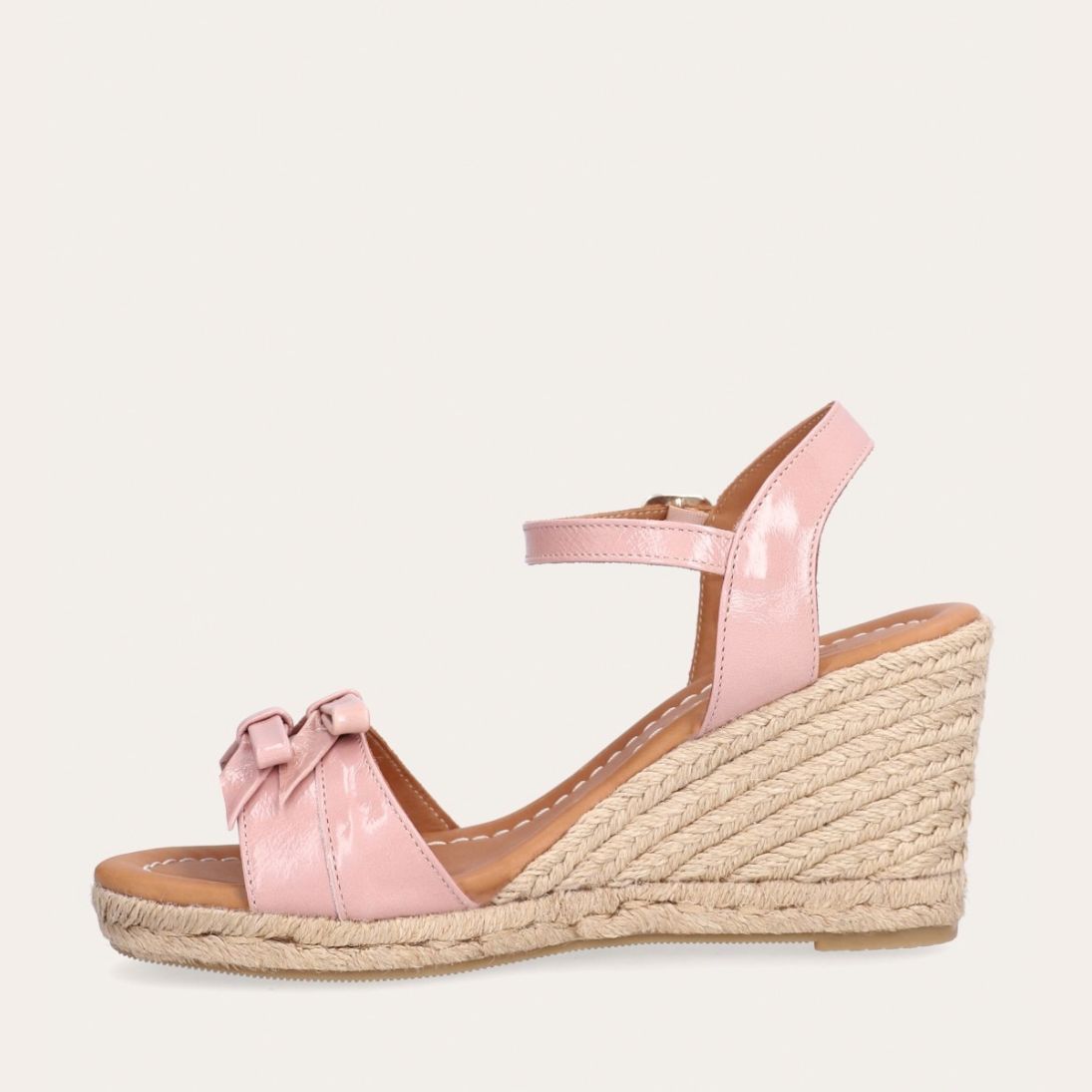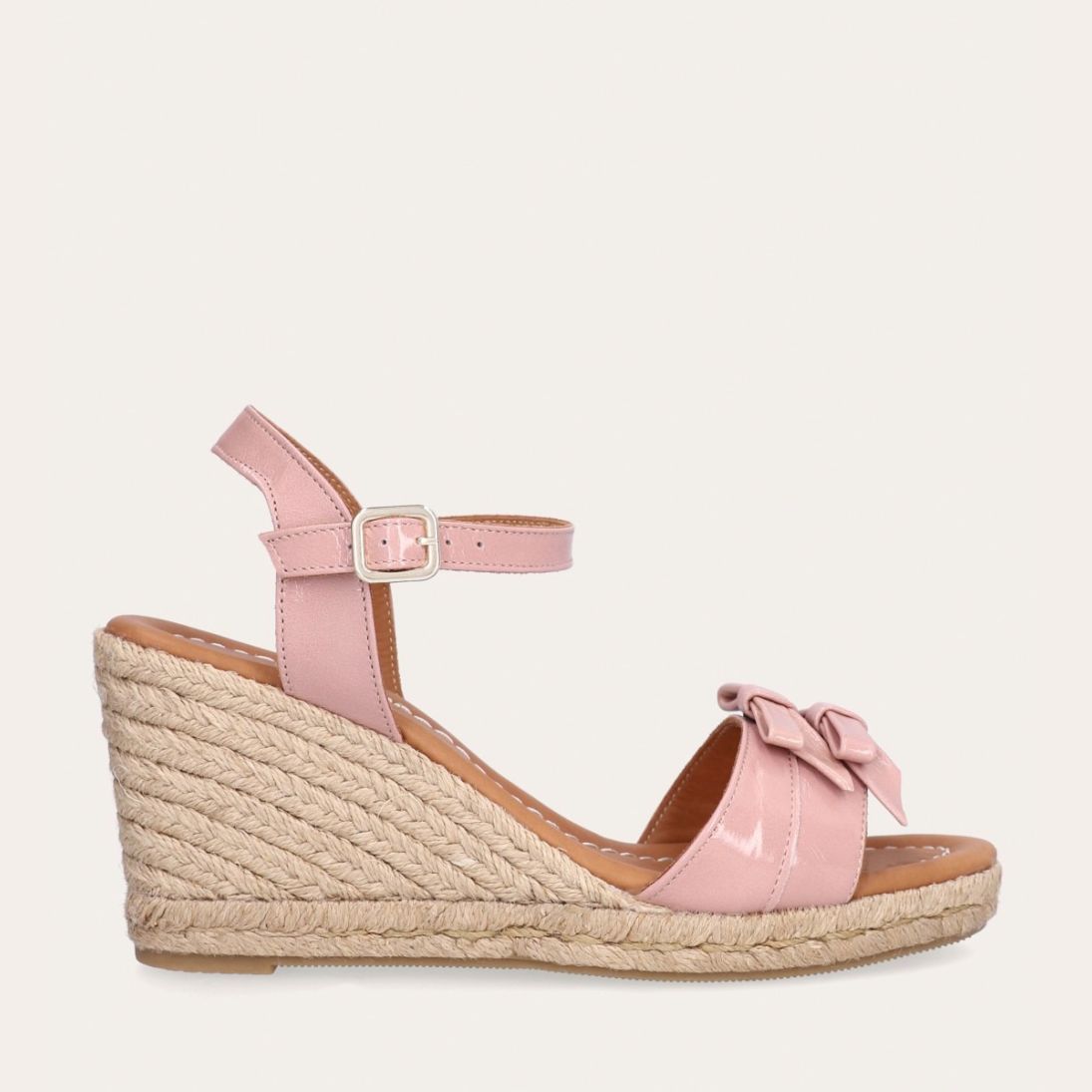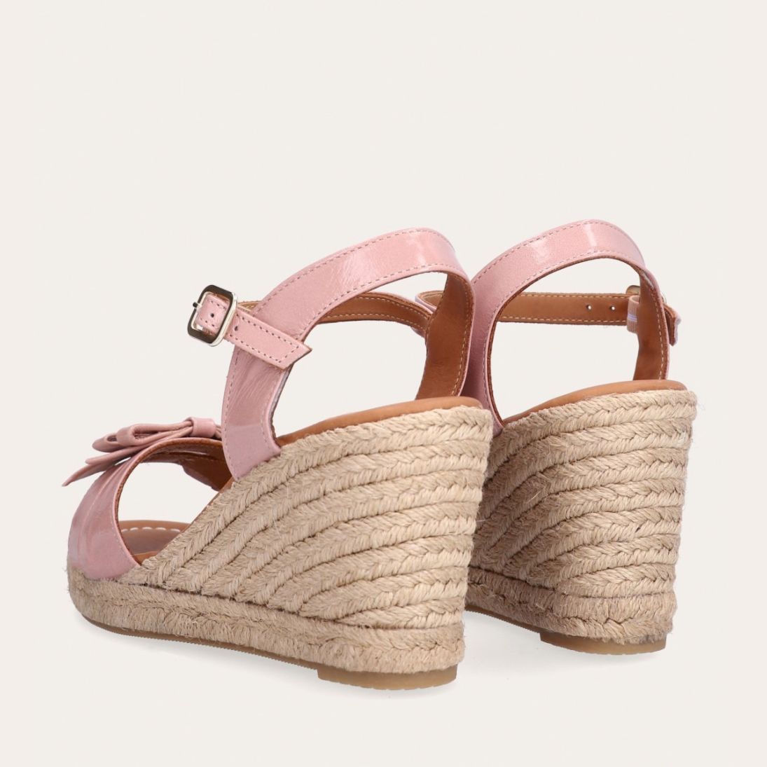 Håndlavet kilesandal udført i lyserødt lakeret skind med rund tå og høj hæl. Sandalen er designet med to små sløjfer foran, samt en rem om anklen som lukkes med et sølv spænde.