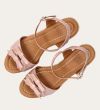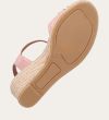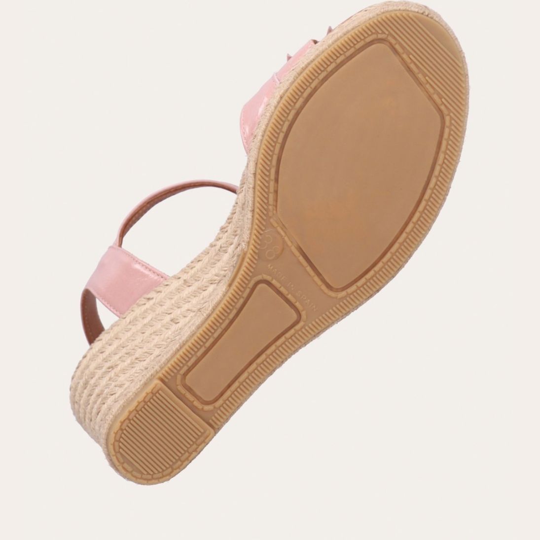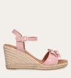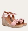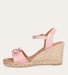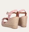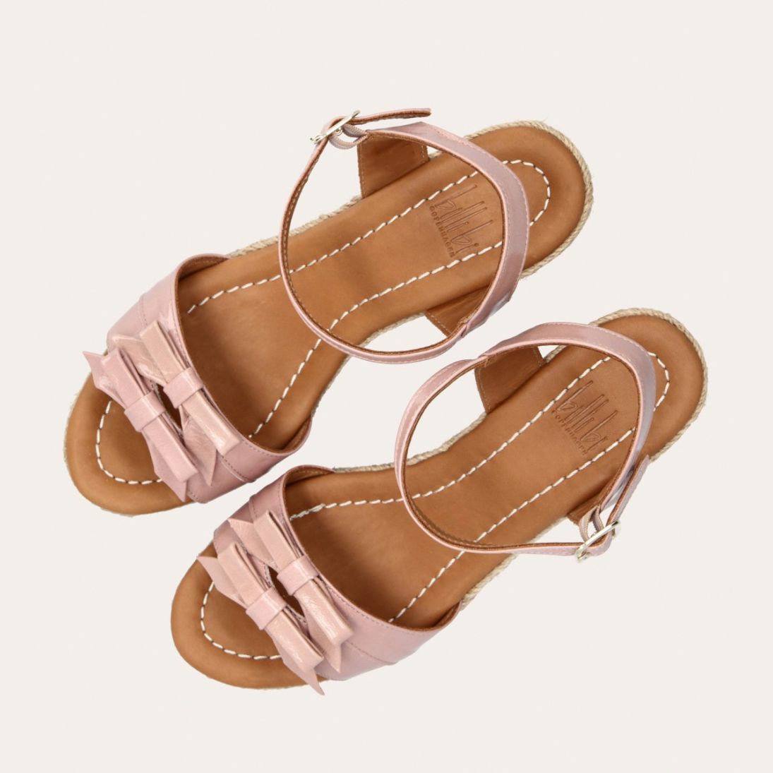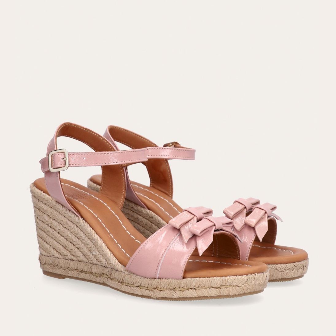Håndlavet kilesandal udført i lyserødt lakeret skind med rund tå og høj hæl. Sandalen er designet med to små sløjfer foran, samt en rem om anklen som lukkes med et sølv spænde.