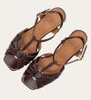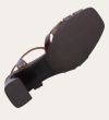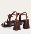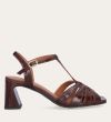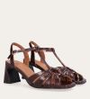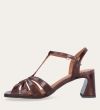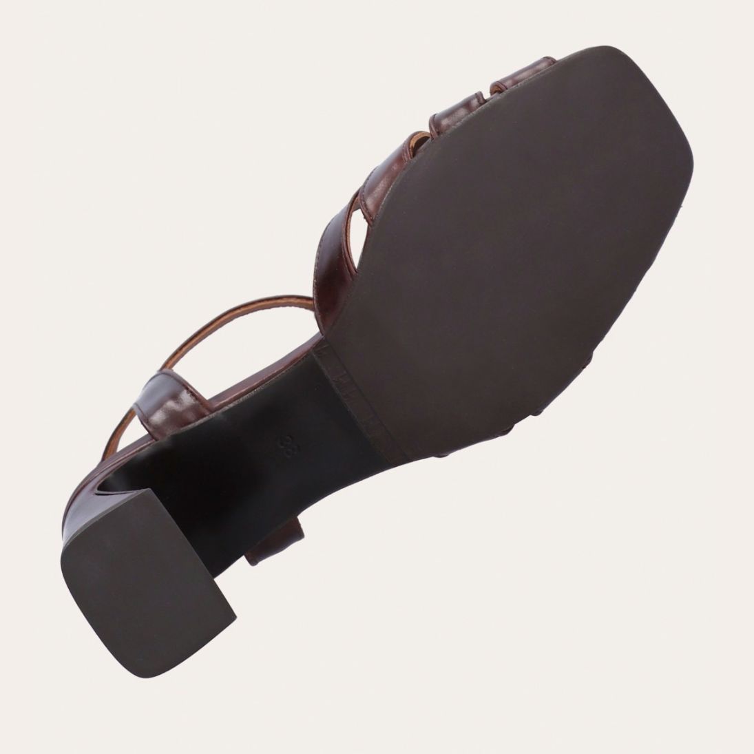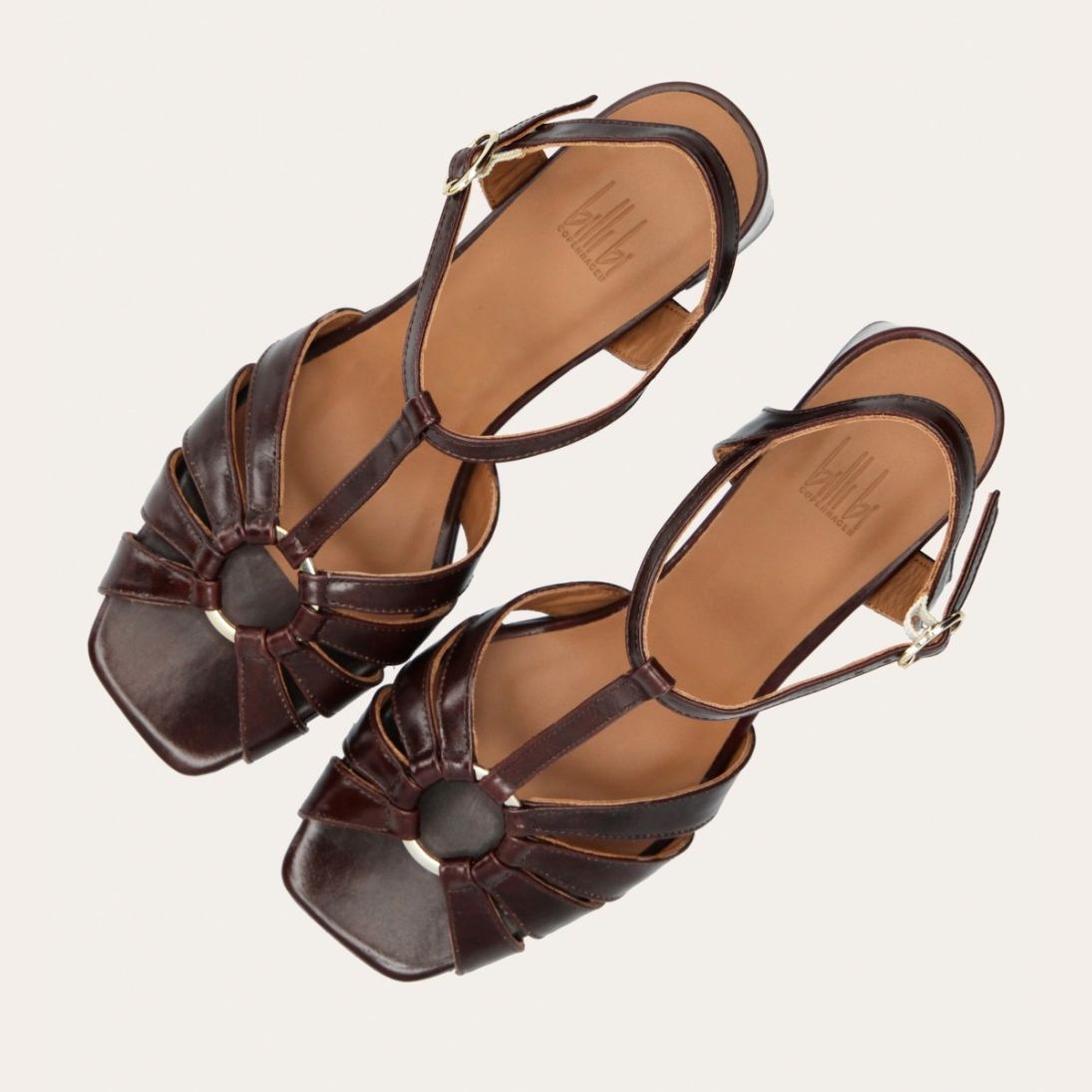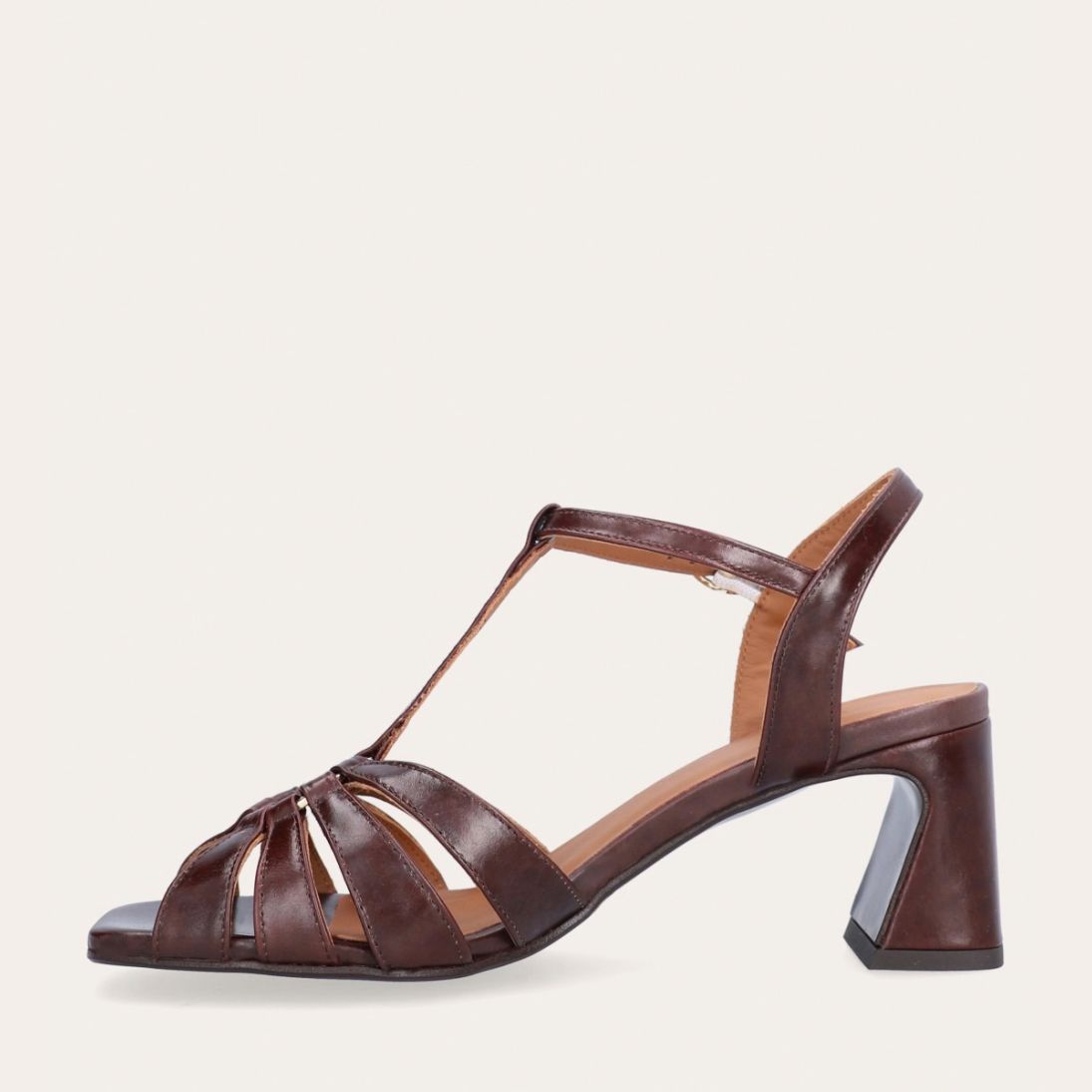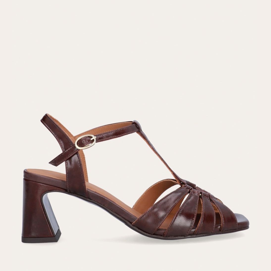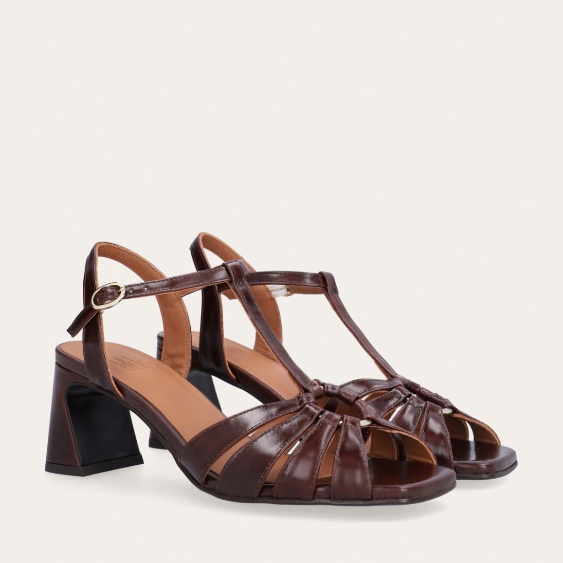 Håndlavet sandal på hæl, udført i brunt glat skind med firkantet tå og en høj skindbetrukket hæl. Sandalen har remme foran, og den justerbare ankelrem lukkes med et gyldent spænde.