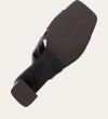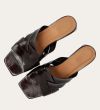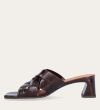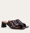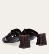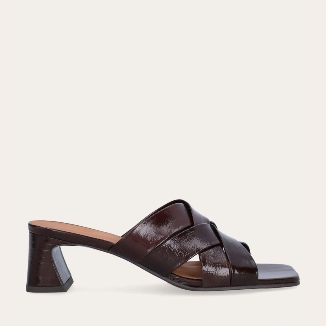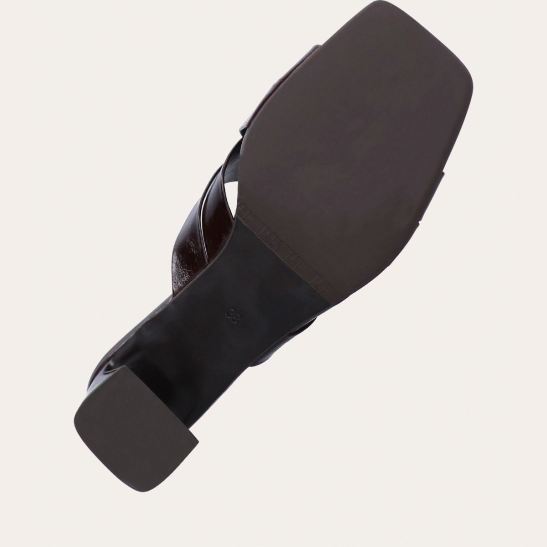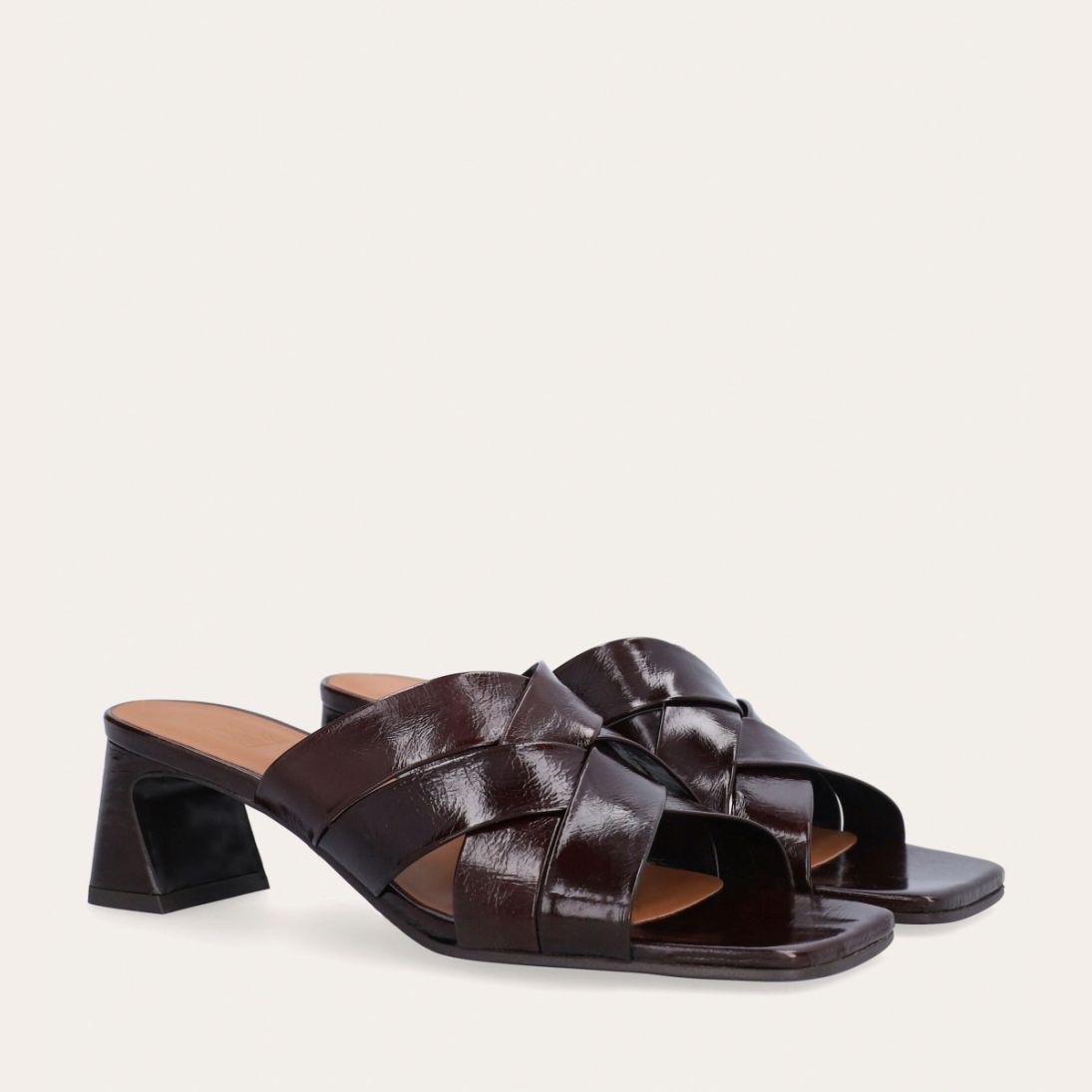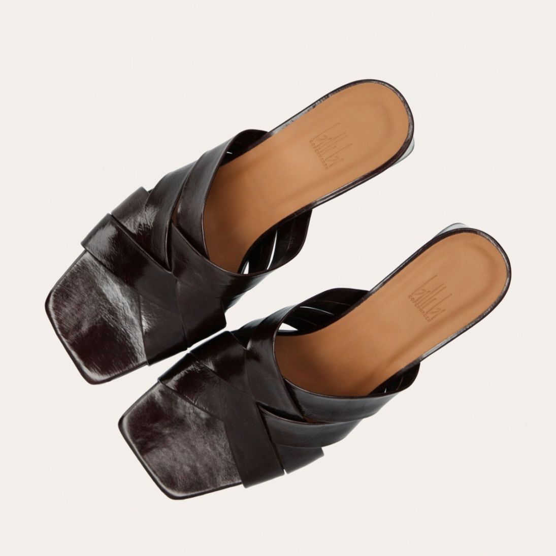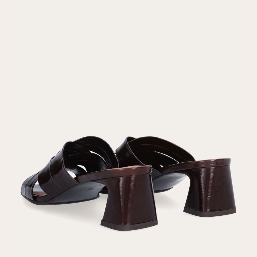 Håndlavet sandal på hæl, udført i mørkebrunt lakeret skind med firkantet tå og en høj betrukket blokhæl. Dekoreret med læderremme flettet hen over forfoden og åben tå.