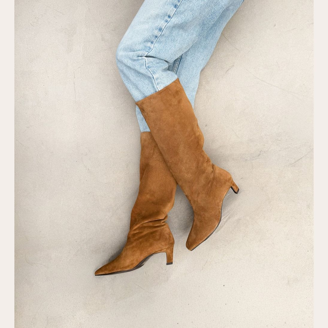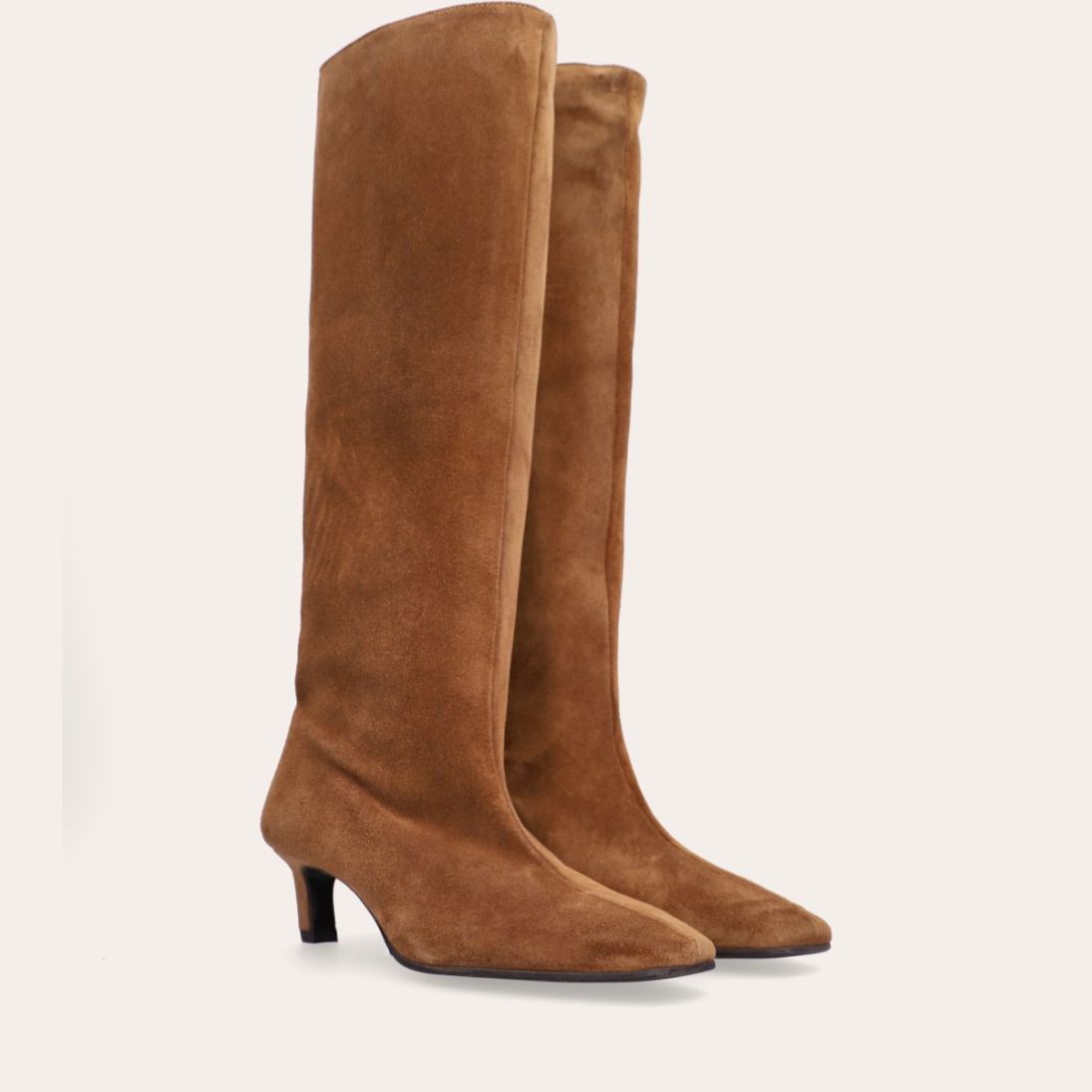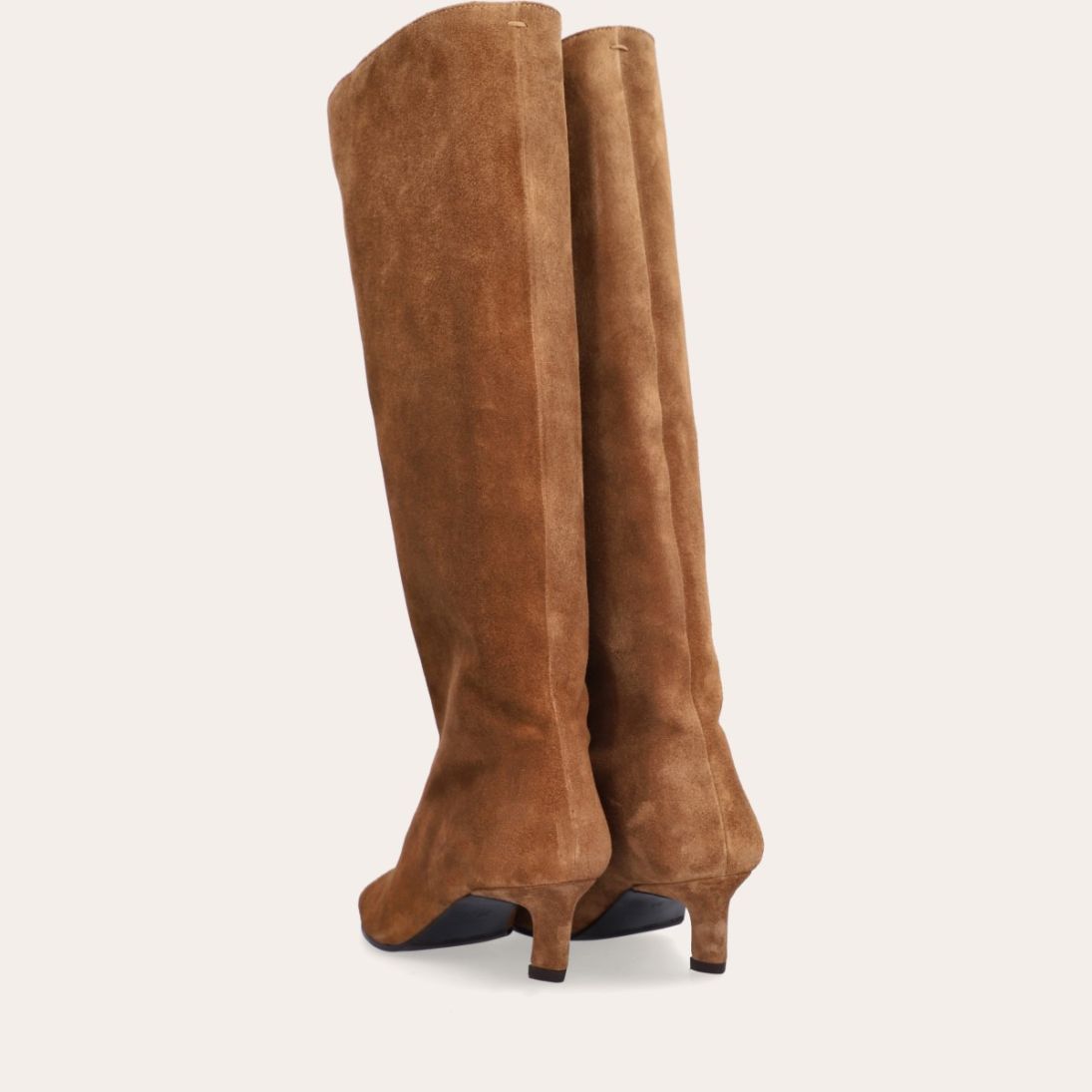 Håndlavet langskaftet støvle udført i cognac-farvet ruskind med en spids, firkantet tå. Støvlen har et langt skaft med en let løs pasform, der giver et afslappet og moderne look, samt en mellemhøj, skindbetrukket kitten heel.