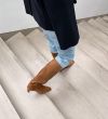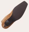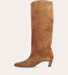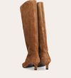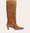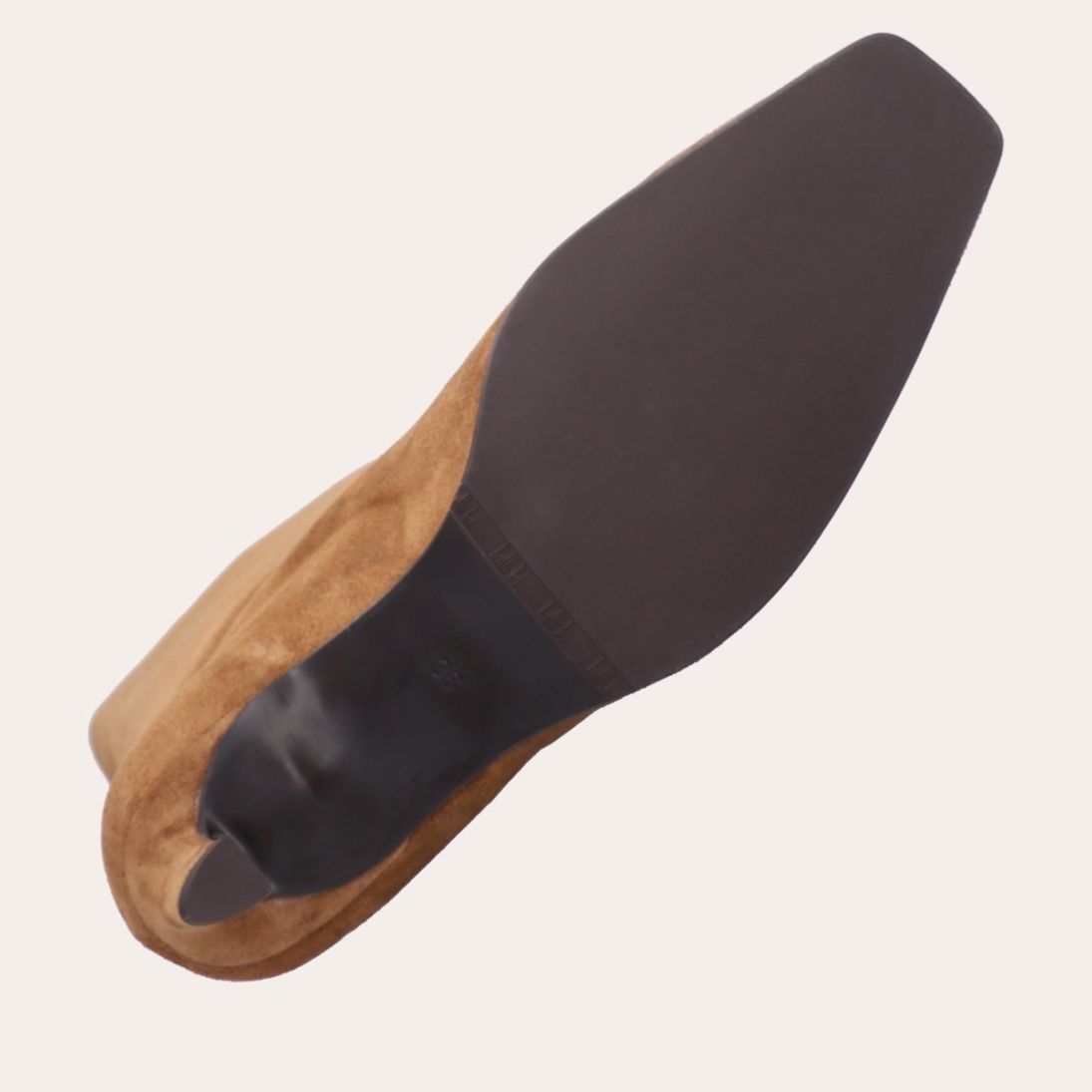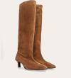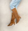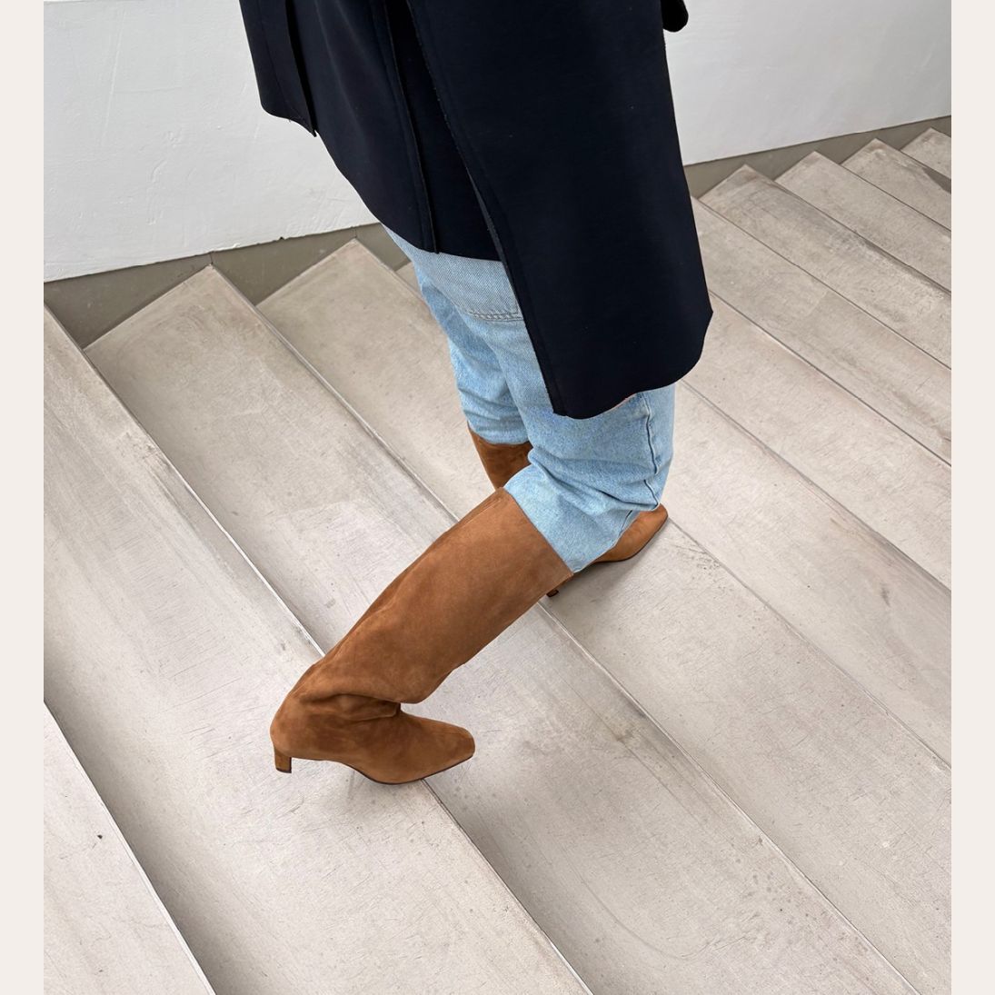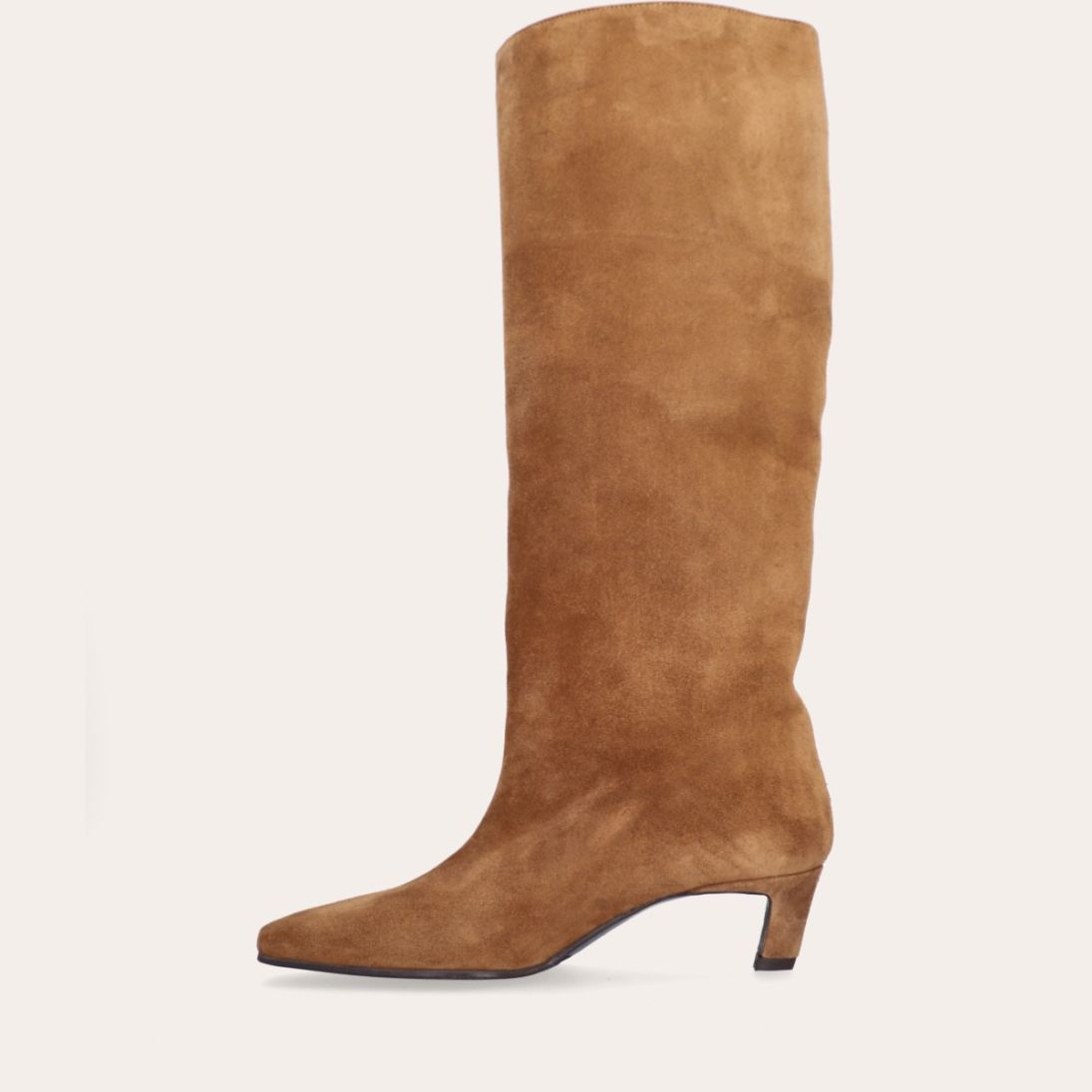 Håndlavet langskaftet støvle udført i cognac-farvet ruskind med en spids, firkantet tå. Støvlen har et langt skaft med en let løs pasform, der giver et afslappet og moderne look, samt en mellemhøj, skindbetrukket kitten heel.
