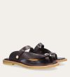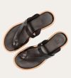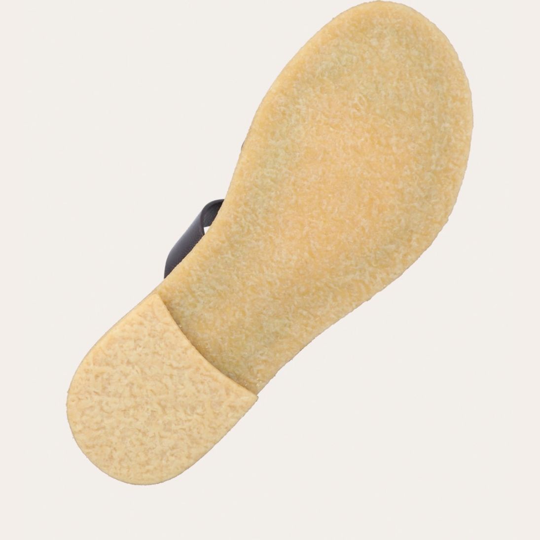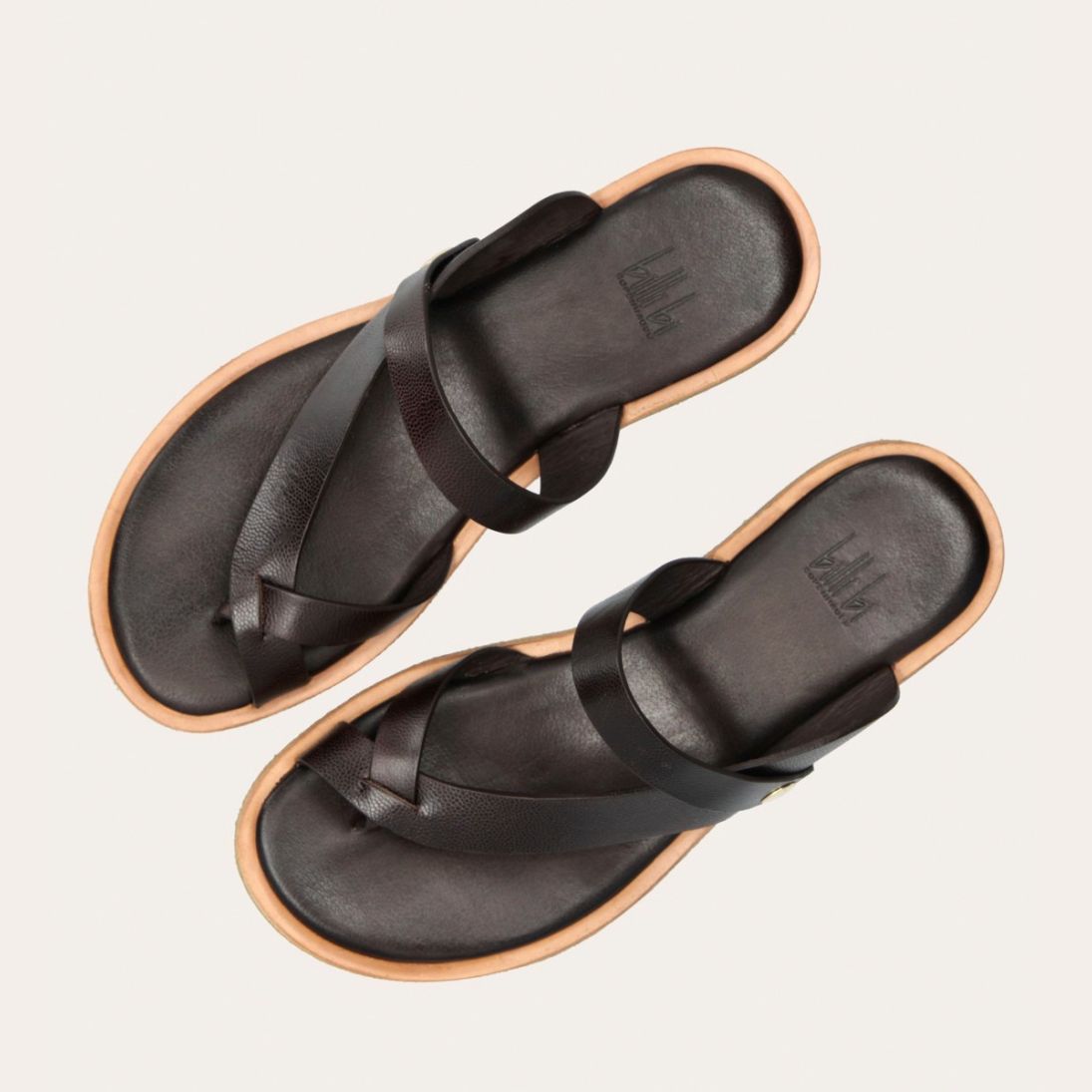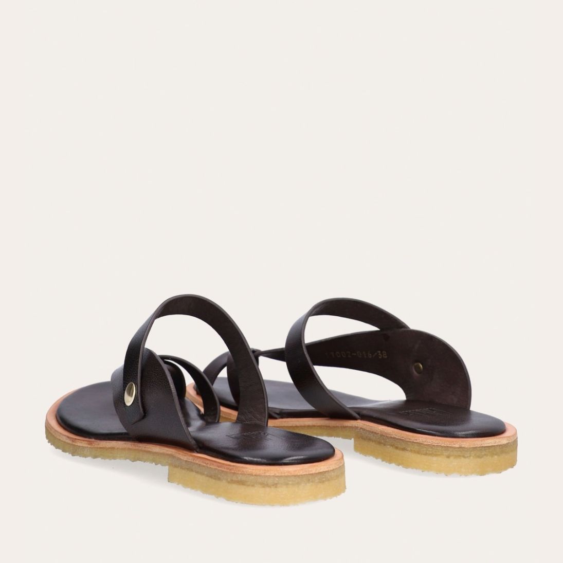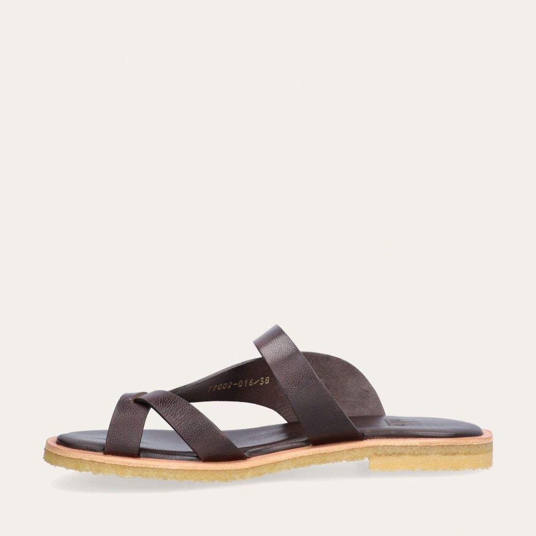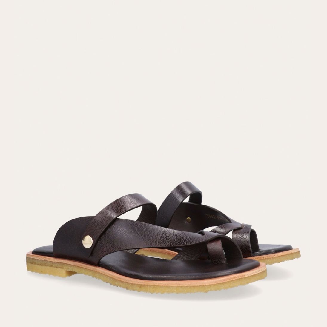 Håndlavet sandal udført i mørkebrunt glat skind med en rund tå. Sandalen har stropper der krydser henover hinanden foran og om storetåen. Derudover har sandalen en rågummisål for optimal komfort.