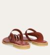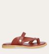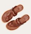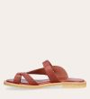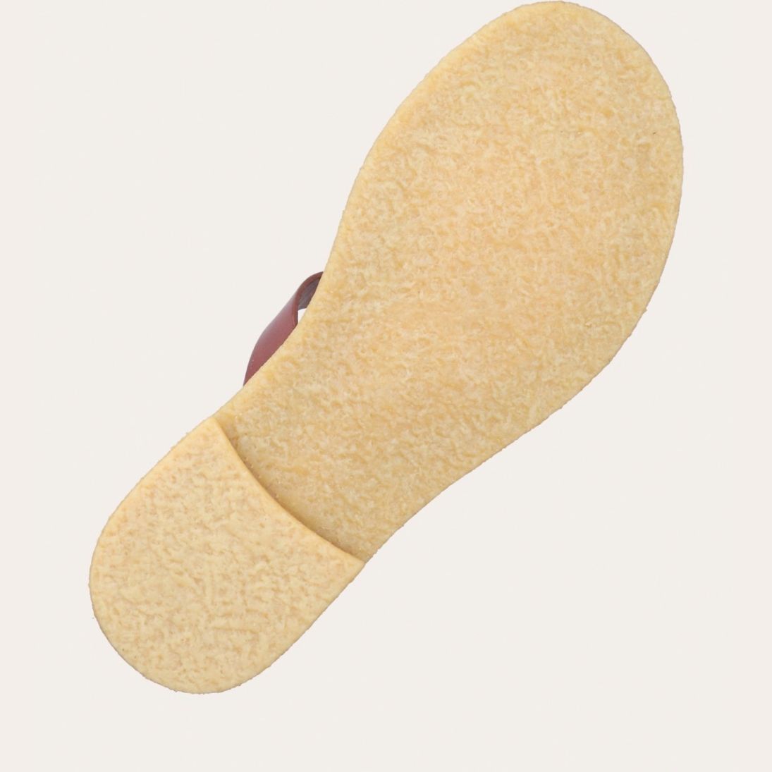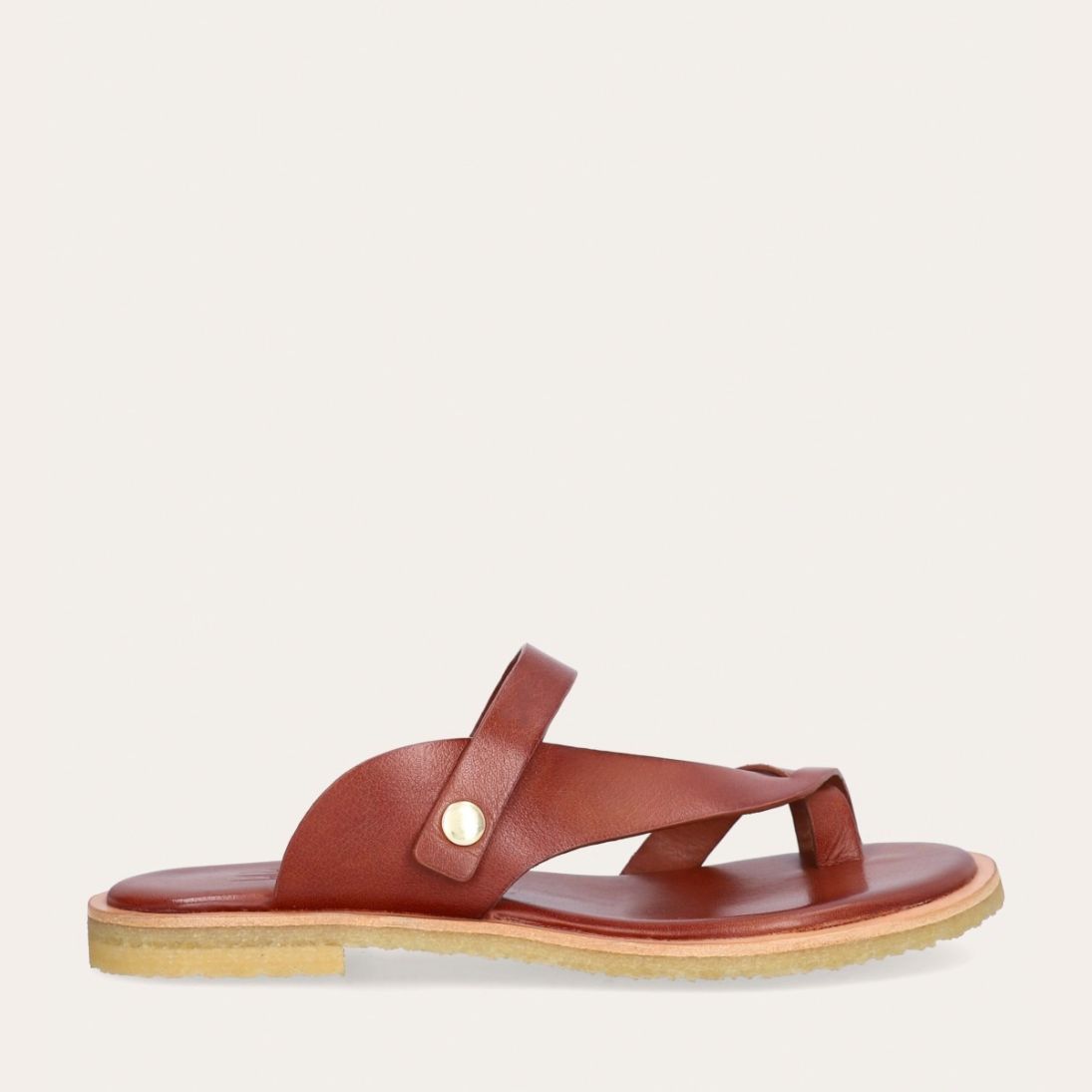 Håndlavet sandal udført i brunt glat skind med en rund tå. Sandalen har stropper der krydser henover hinanden foran og om storetåen. Derudover har sandalen en rågummisål for optimal komfort.