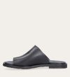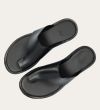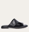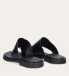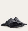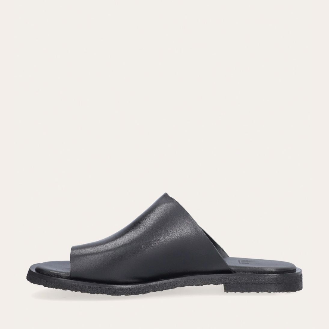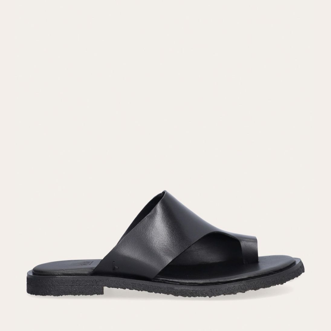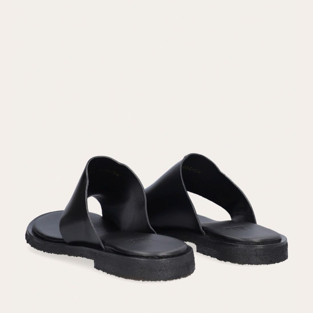 Håndlavet slip-on sandal udført i sort glat skind med en rund tå. Sandalen er designet med asymmetriske sider og en tåstrop. Derudover har sandalen en rågummisål for optimal komfort.