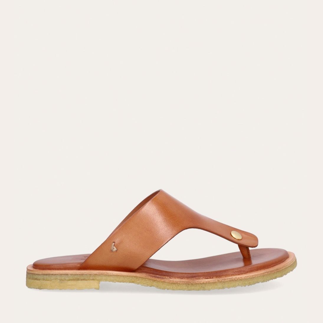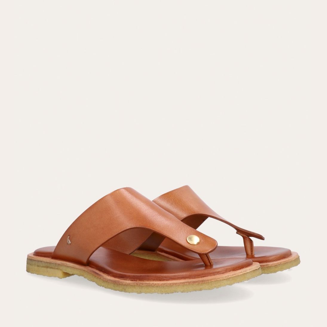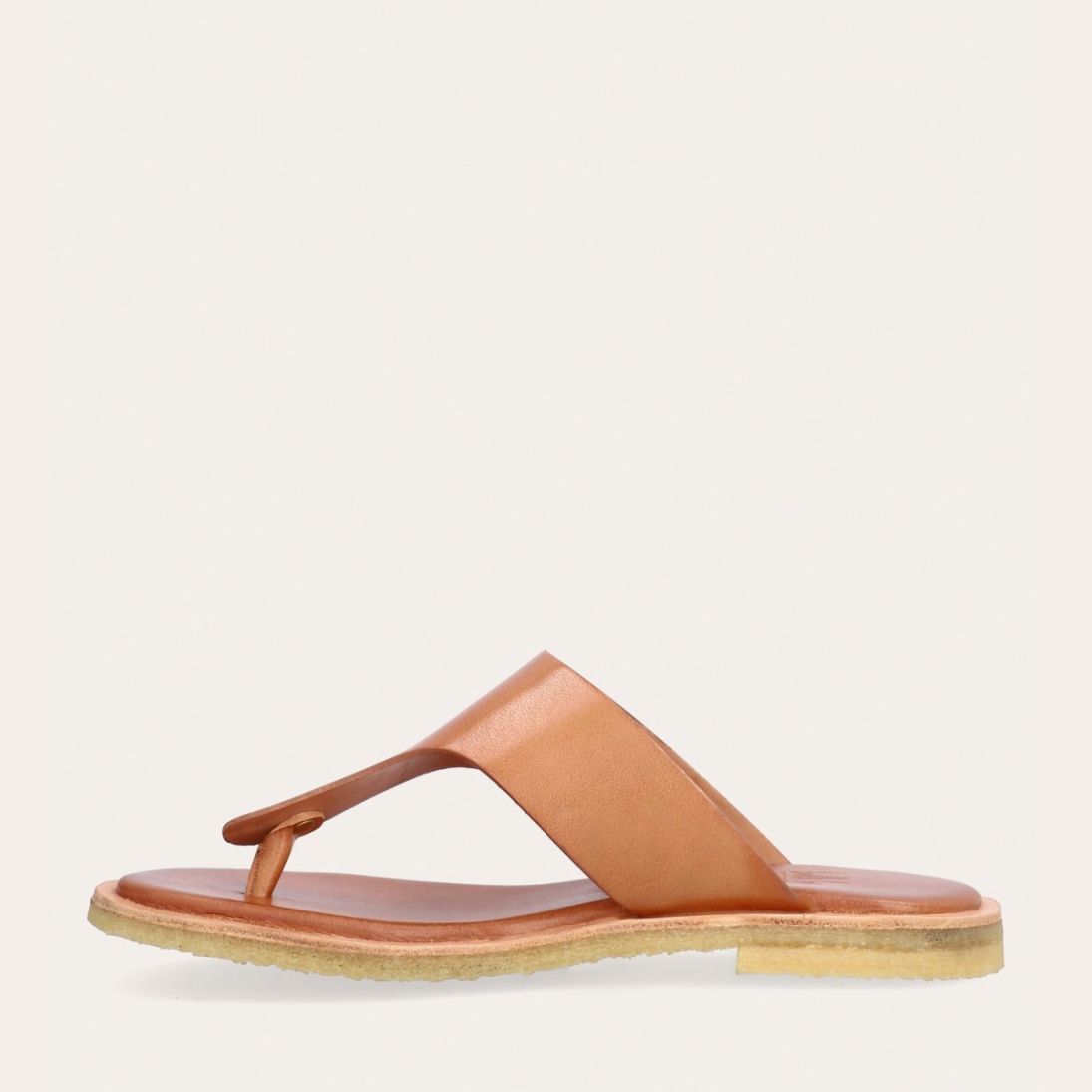Håndlavet slip-on sandal udført i lysebrunt glat skind med en rund tå. Sandalen er designet med en tåstrop og en rågummisål for optimal komfort.